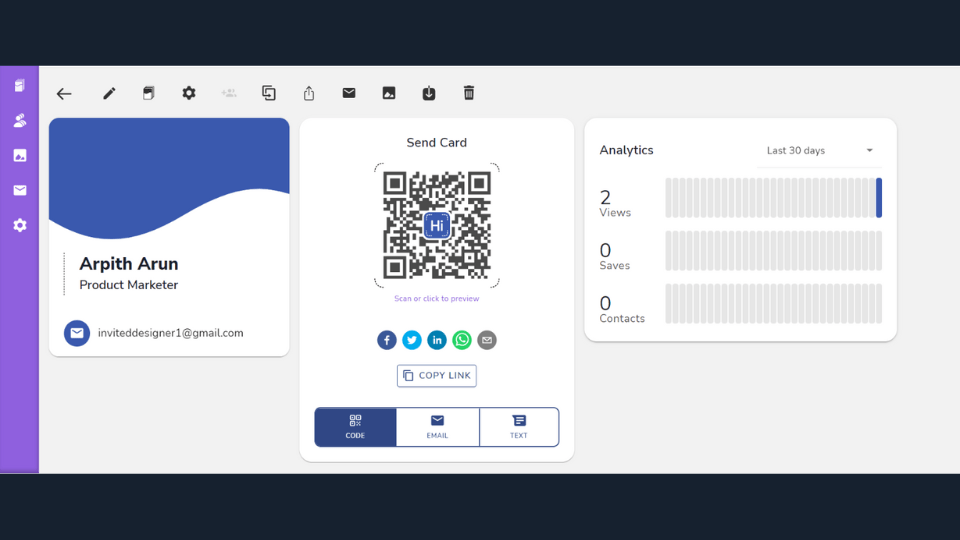 Analytics takes the form of data like the number of unique users scanning your digital business cards, the devices they use, the location of scans, times of day when your digital business cards receive the most scans, and top-performing digital business cards to know which networking campaigns are yielding more results.