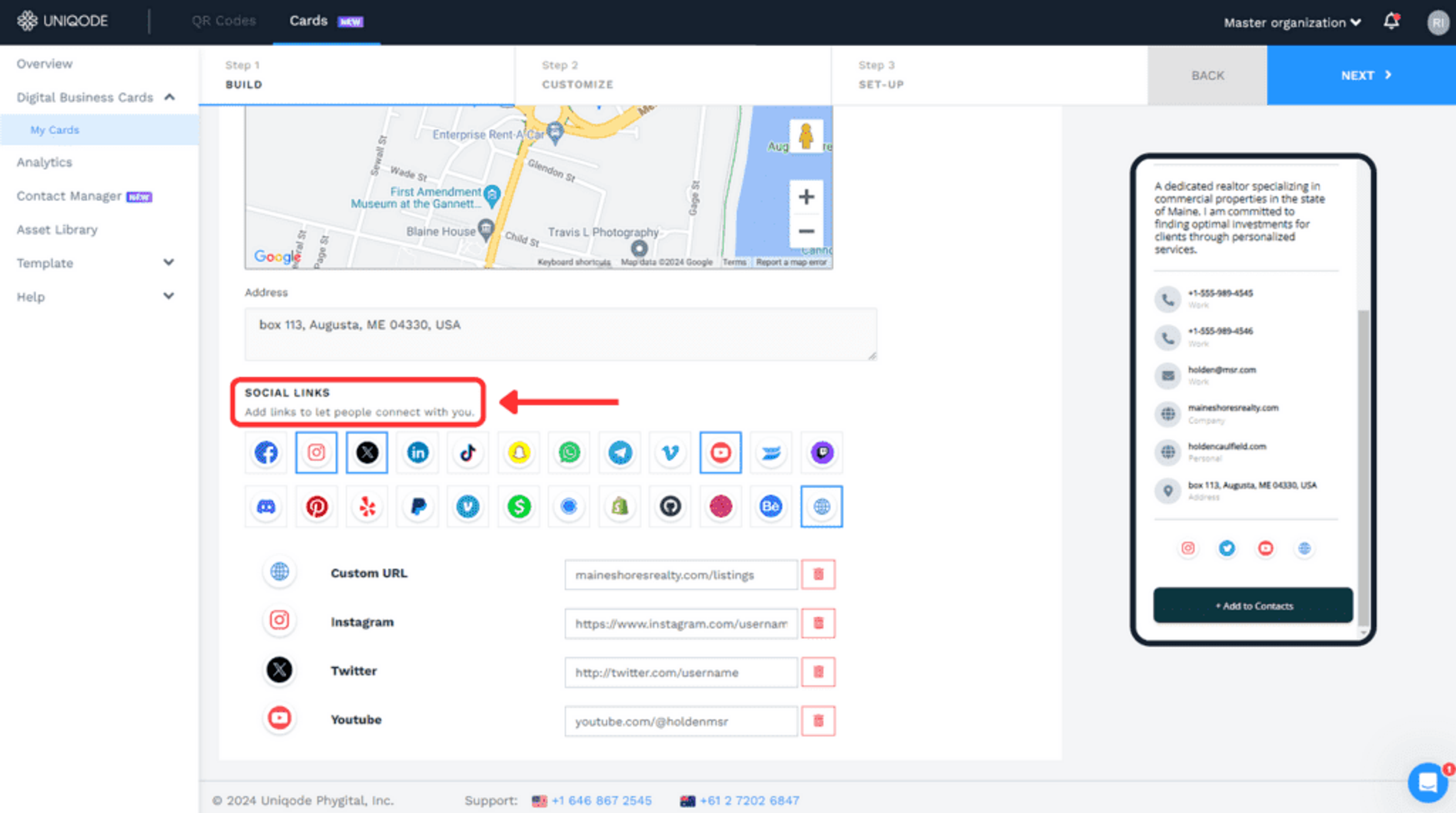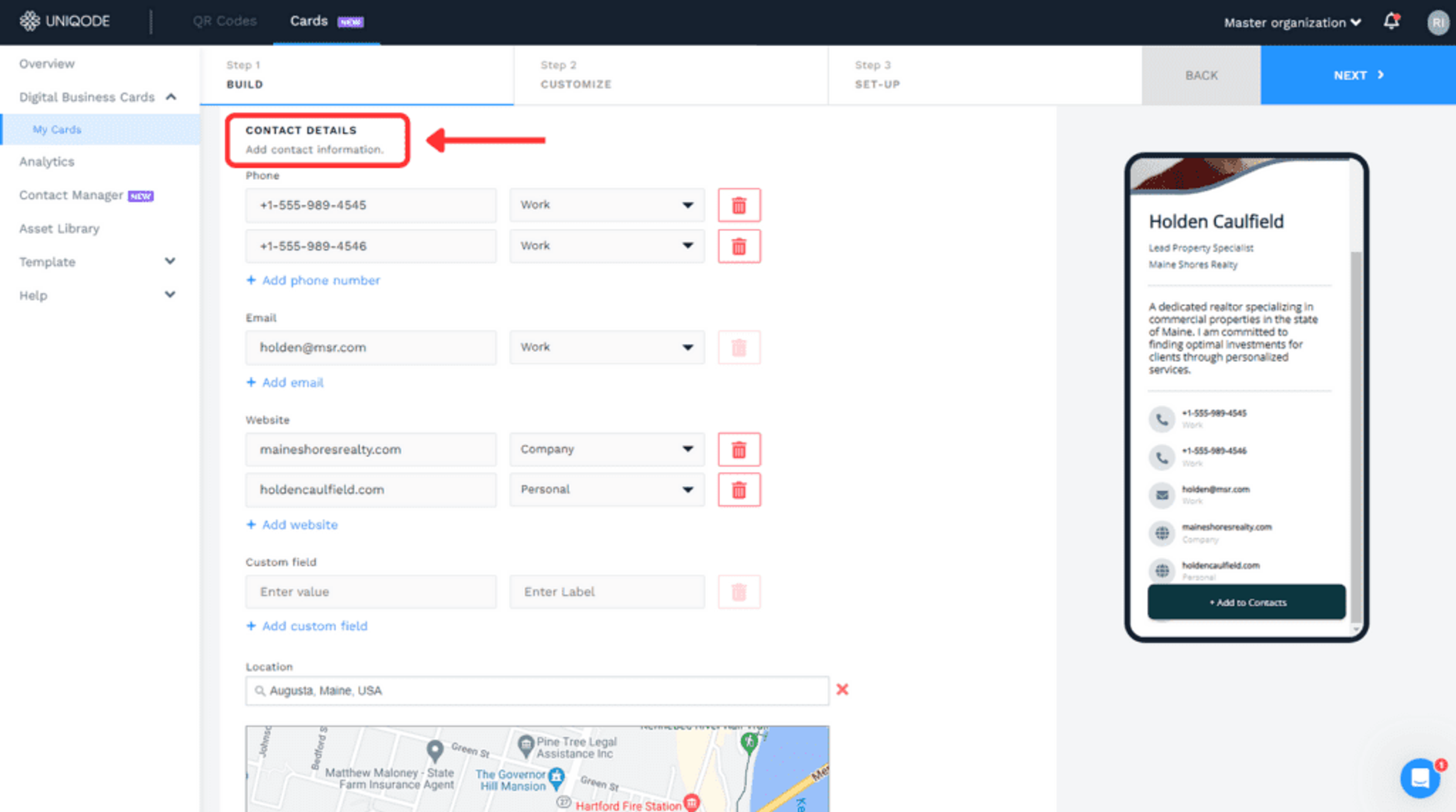 The “CONTACT DETAILS” section of the “BUILD” tab is where you can include your contact information. Add your phone numbers, email addresses, website links, and geographical location.
