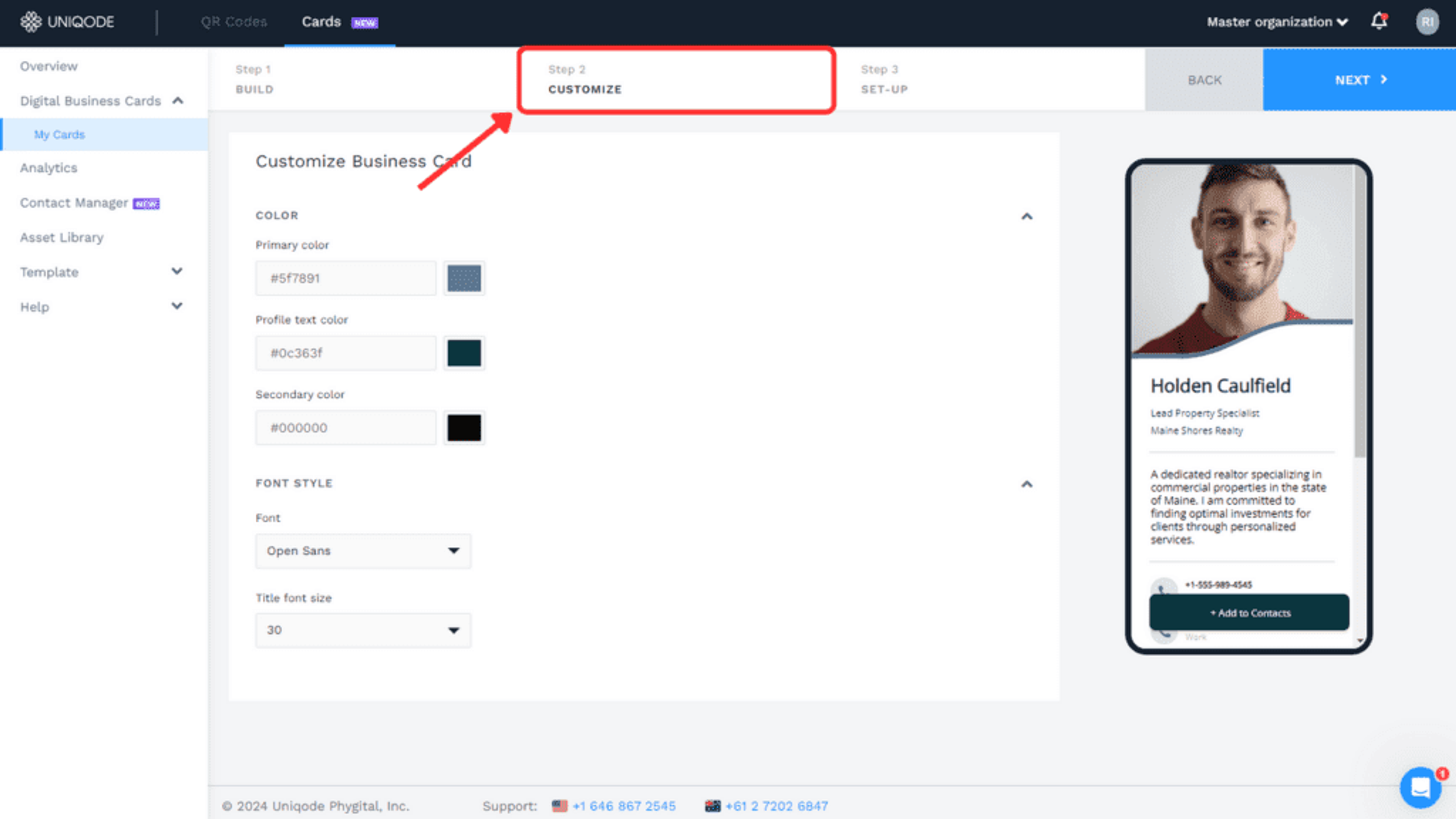 Under the “CUSTOMIZE ” tab, you can customize your e-business card’s visuals. You can choose from various font styles and sizes and adjust its various color aspects.