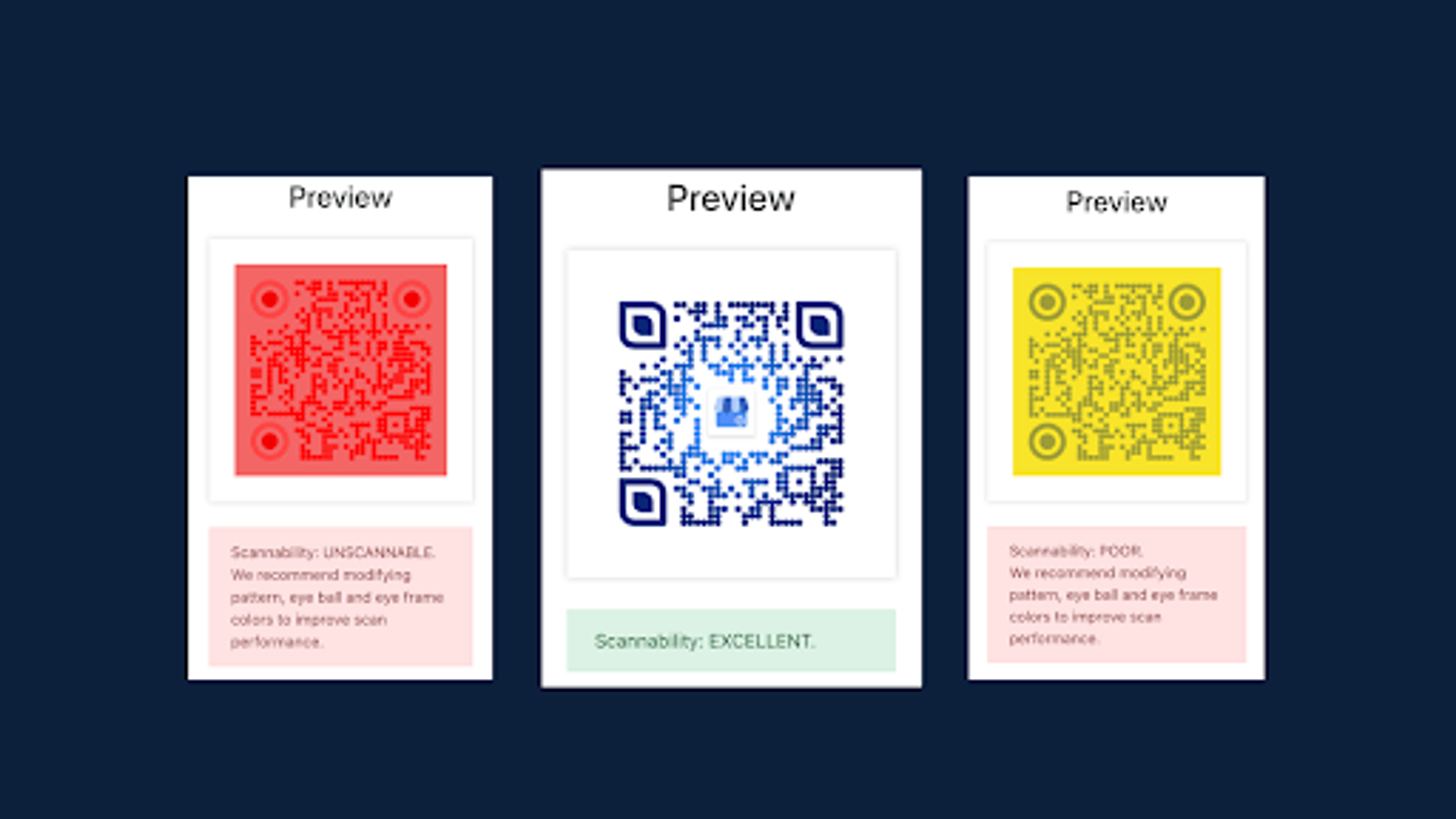 However, this balance can be tricky to strike. It could be hard to guess whether a QR Code is scannable. And downloading it after every design tweak to test its scannability is cumbersome.