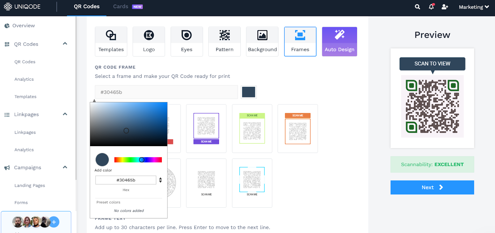 Customize QR Code per your branding guidelines. Click “Next”‘.