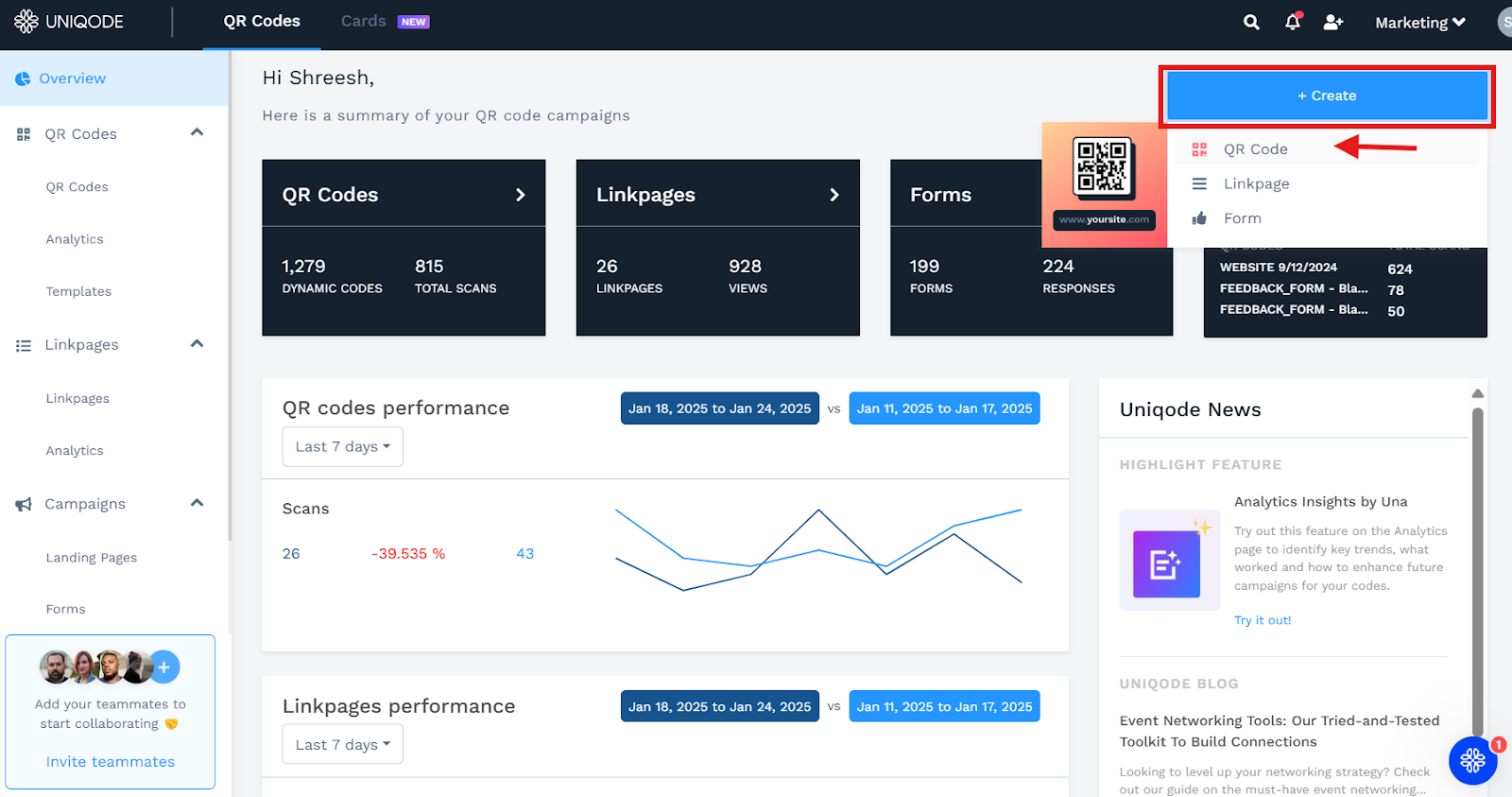 Log in to the Uniqode dashboard, click “+Create,” and select “QR Codes.”