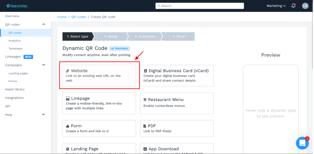 Step 2: Select ‘Website’ from the list of QR Code campaign types available