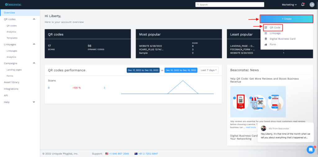 Step 1: Log in to your Uniqode dashboard, click on ‘+Create,’ and choose ‘QR Code’