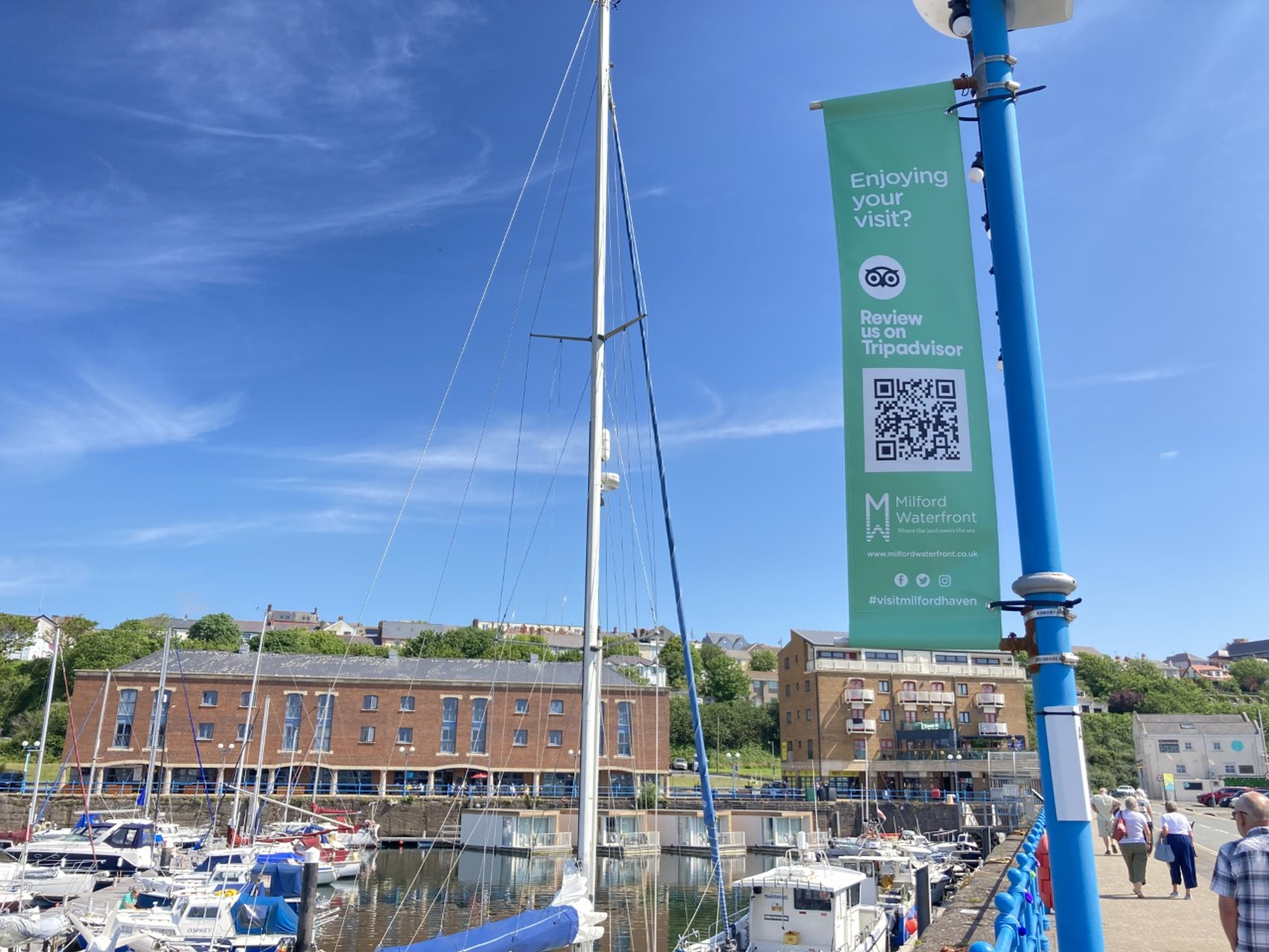 Milford Waterfront, a UK-based tourist attraction, uses a Triadvior QR Code on catchy banners set in the venue for reviews.