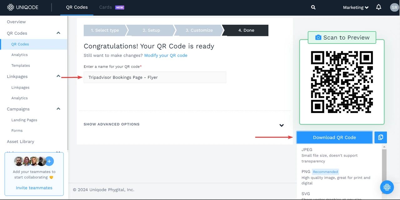 Before you proceed…To create a Tripadvisor QR Code with advanced features such as dynamic, multi-link QR Codes and the ability to add a logo, sign-up on Uniqode. Everything is free for 14 days!