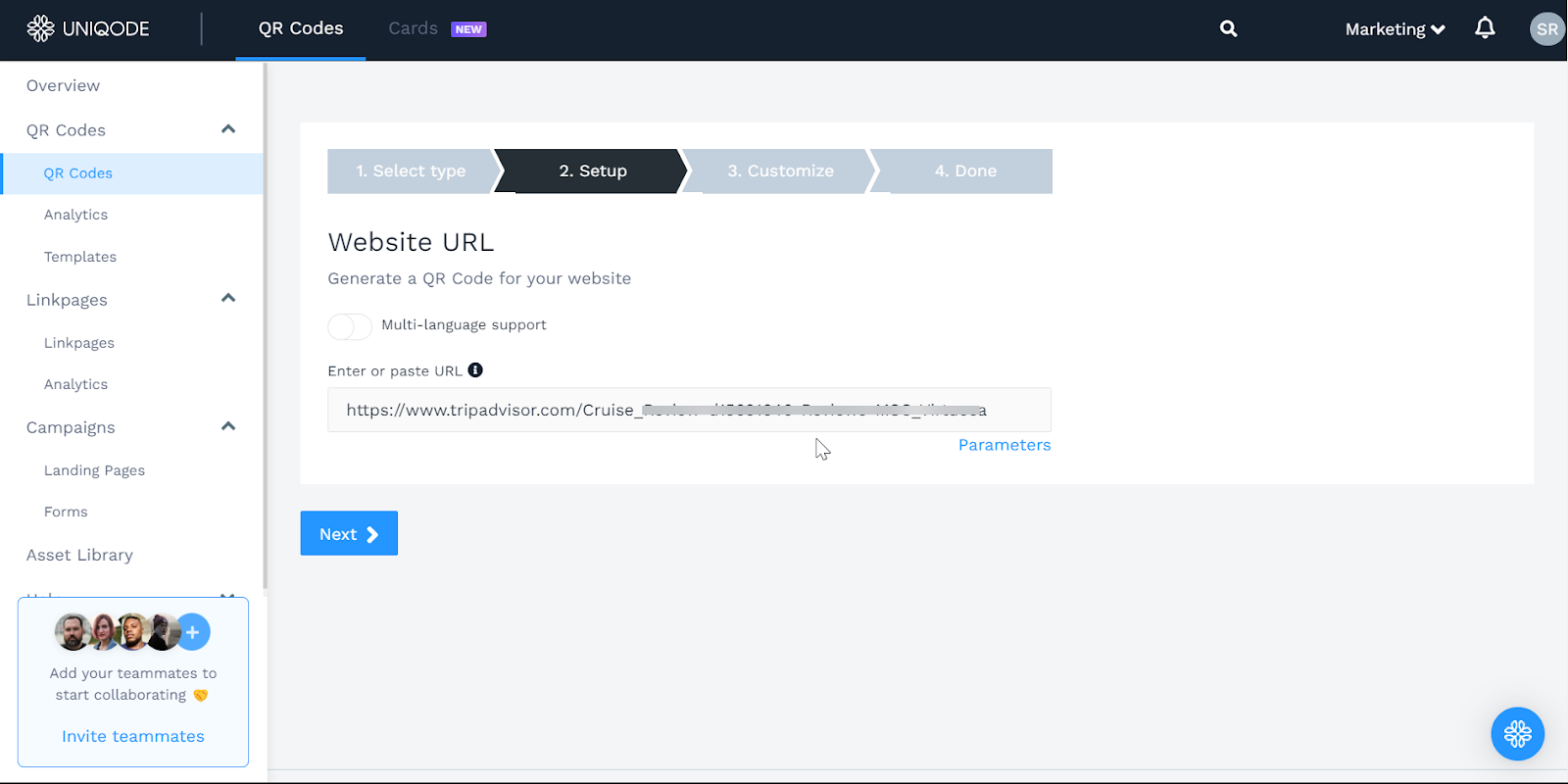 - Choose “Website” and paste your TripAdvisor review link in the URL field. (You can choose between QR Code types such as Website, Linkpage, Form, Landing Page, etc. based on what content you want to redirect users to)