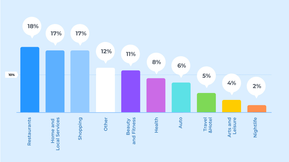 Retail brands comprise 17% of the total number of businesses on Yelp.