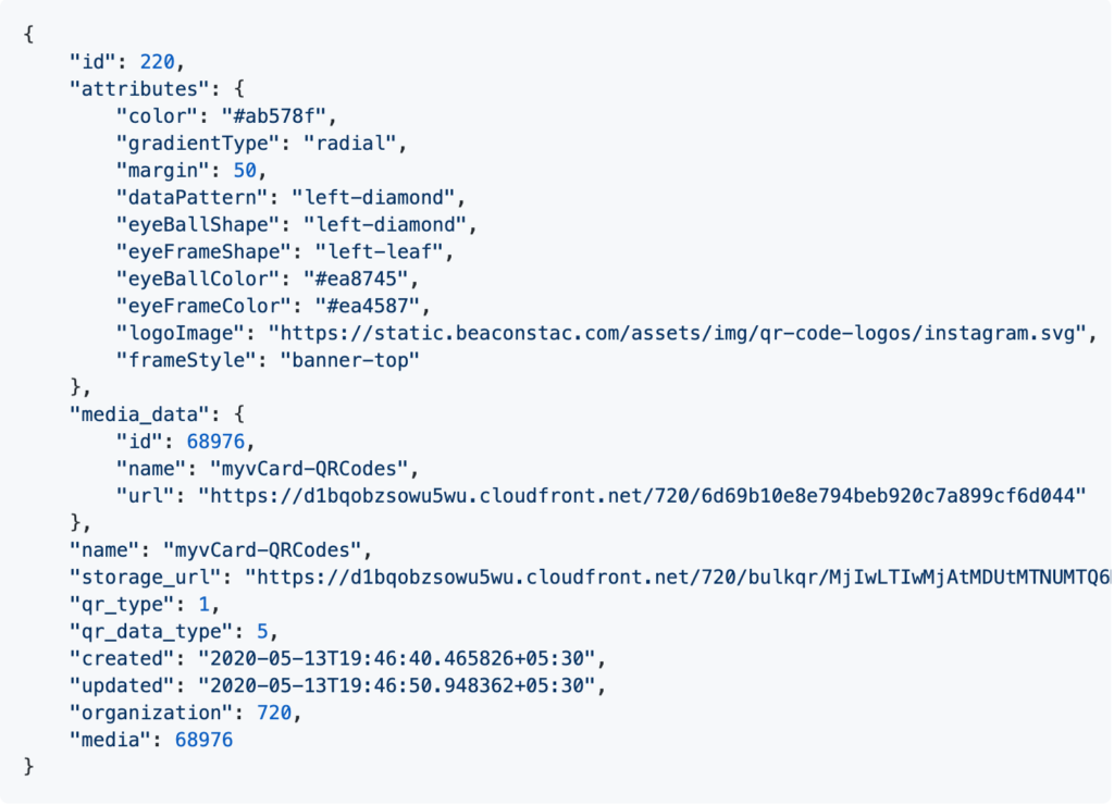 Pass the CSV file along with the design attributes, authorization token, and other fields such as QR code type and name of the bulk QR code collection through the cURL request. You can customize the design by modifying the attributes of the bulk QR code object.
