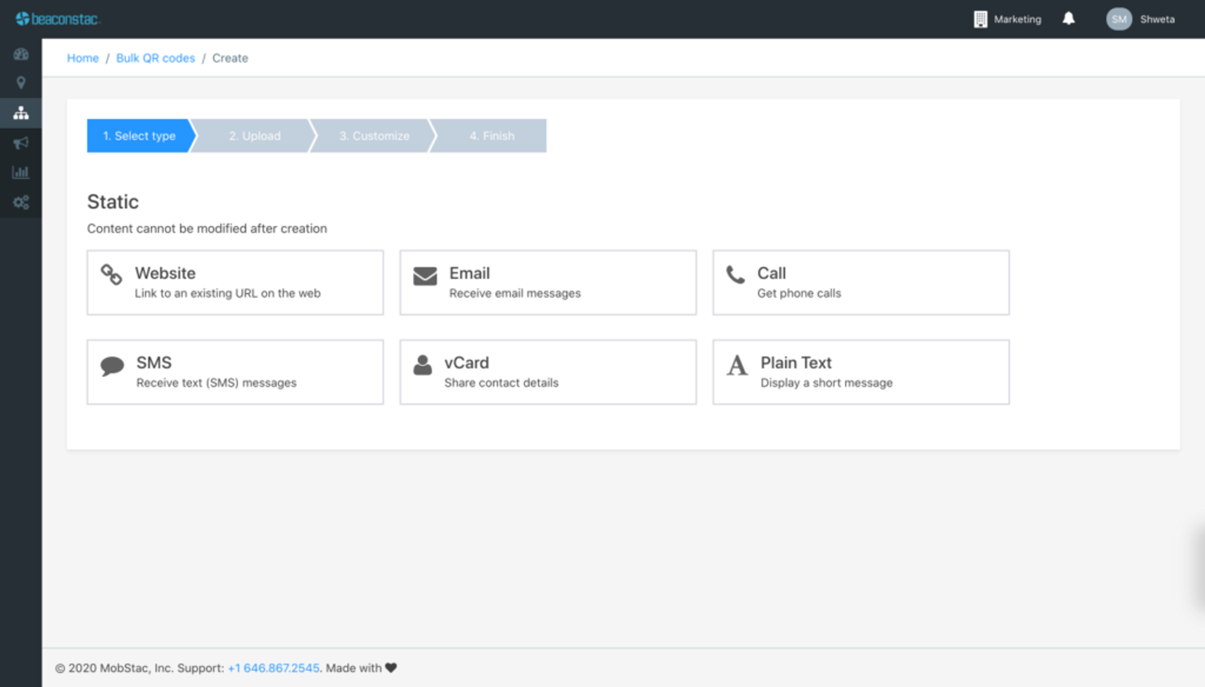Select the type of QR code you want to create in bulk. The different types of bulk QR codes are: