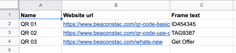This is our template for bulk QR Code creation. It consists of three columns: