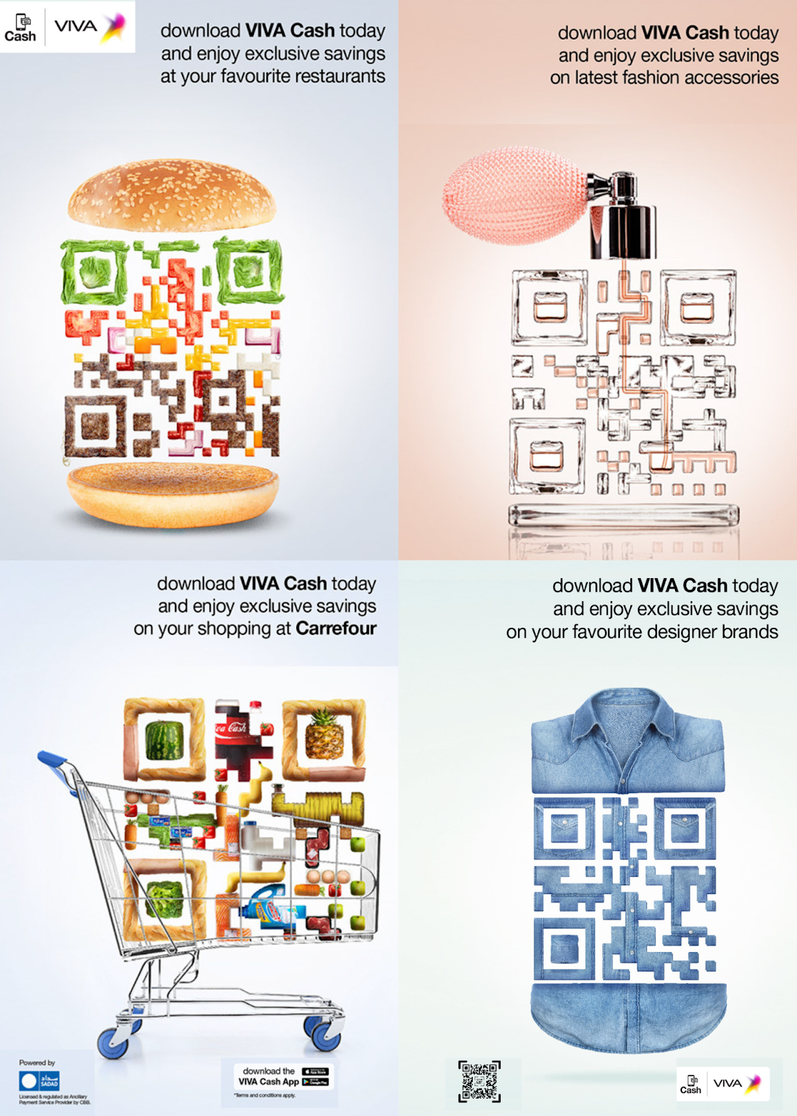 VIVA Cash used this QR Code campaign to promote its mobile wallet app across platforms, creatively embedding QR Codes in visuals representing shopping, dining, and fashion.