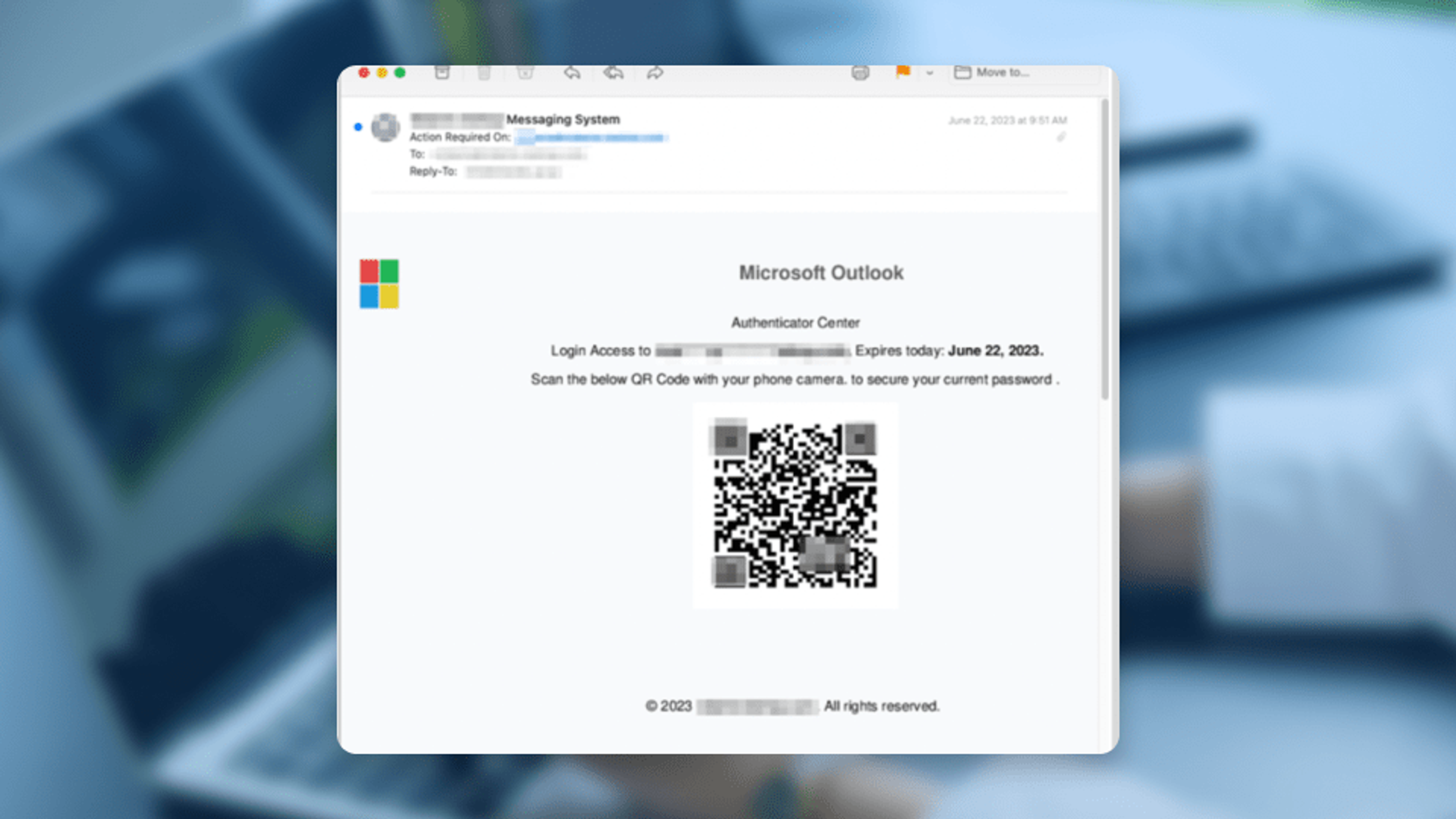 In the above image, a phishing email is disguised as a Microsoft Outlook email asking an unsuspecting user to scan the code to secure their password.