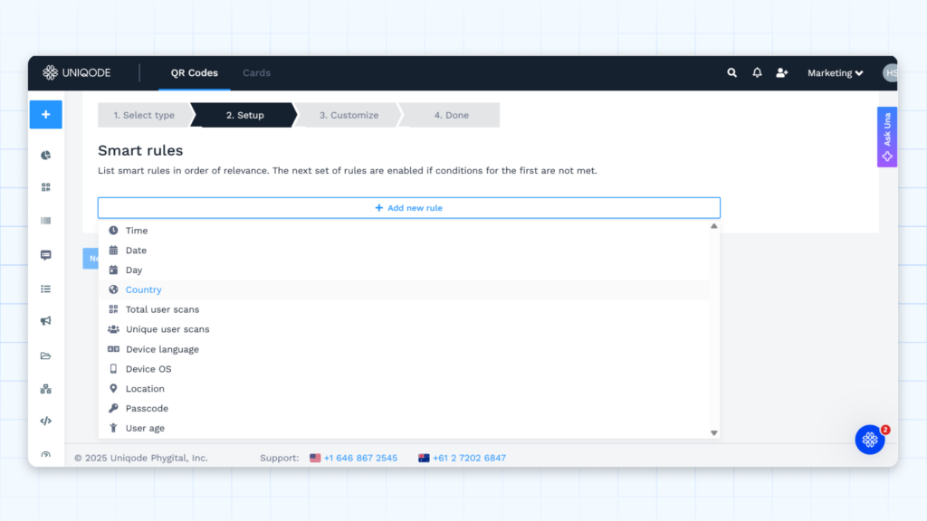 Password protection is available for all dynamic QR Codes on Uniqode as part of its advanced settings, but you can also set it up via the passcode Smart Rules. Smart Rules offer deeper control over who sees what. You can pair the passcode rule with other conditions, such as device type, language, age, or even scan count, to deliver highly targeted, customized post-scan experiences.