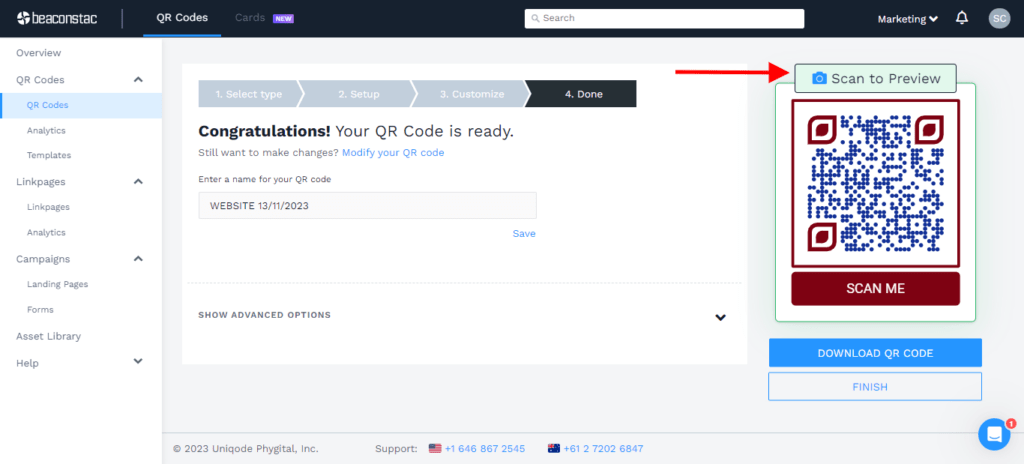 📝 Note: You can test your QR Code before downloading to ensure it’s scanning accurately and directing users to the right destination. The “Scan to Preview” option is a premium feature, available once you sign up for a free trial.