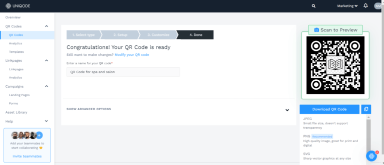 You can create a QR Code for spas and salons in four steps with Uniqode’s QR Code generator.