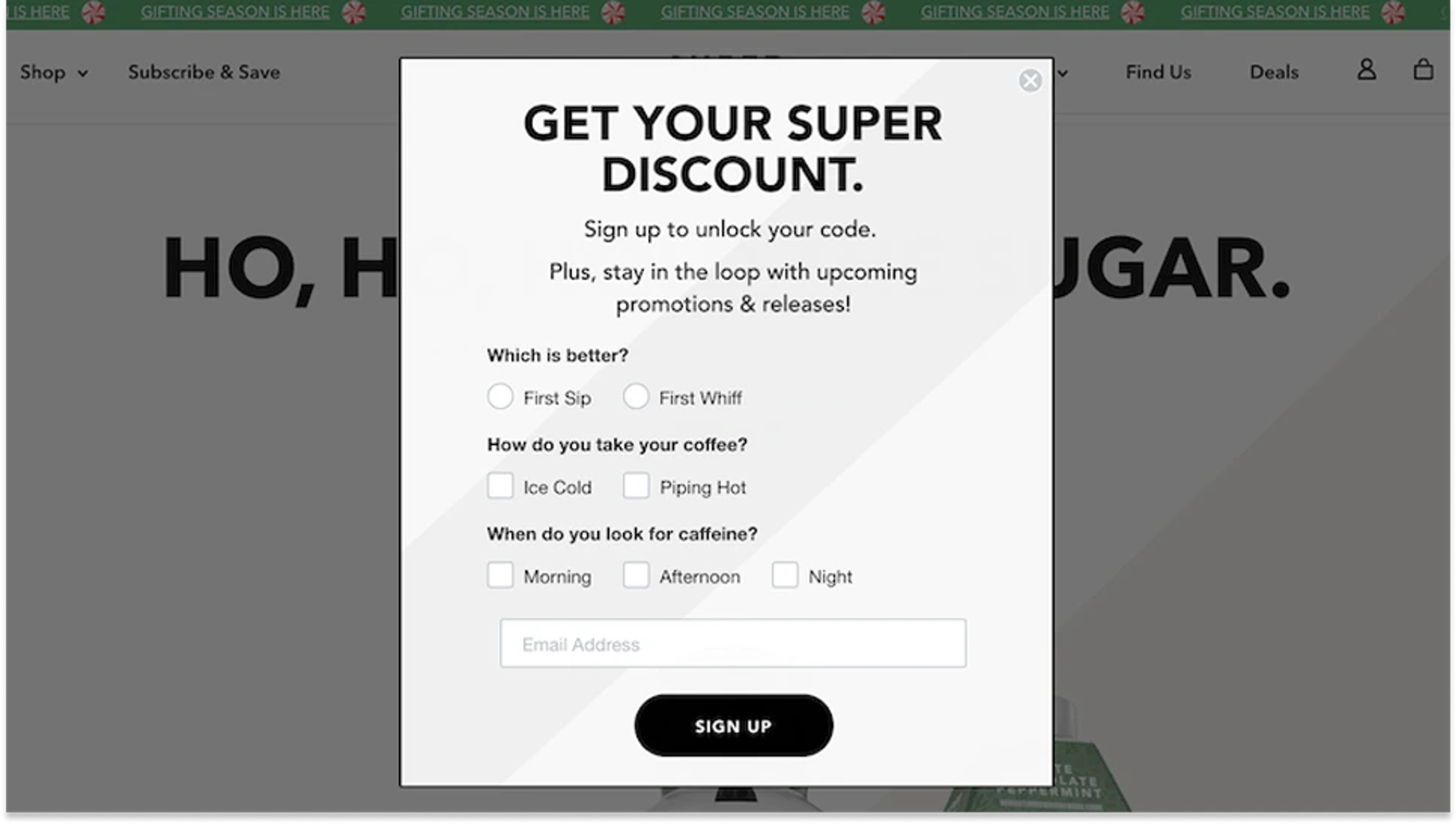 Super Coffee here uses a timed pop-up with a “secret discount,” creating a sense of exclusivity that encourages users to act.