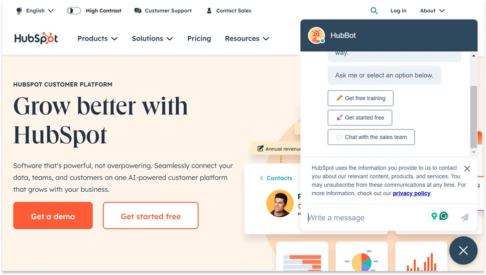 HubSpot uses a live chat feature on its landing page, ensuring visitors have quick access to help if they need it.