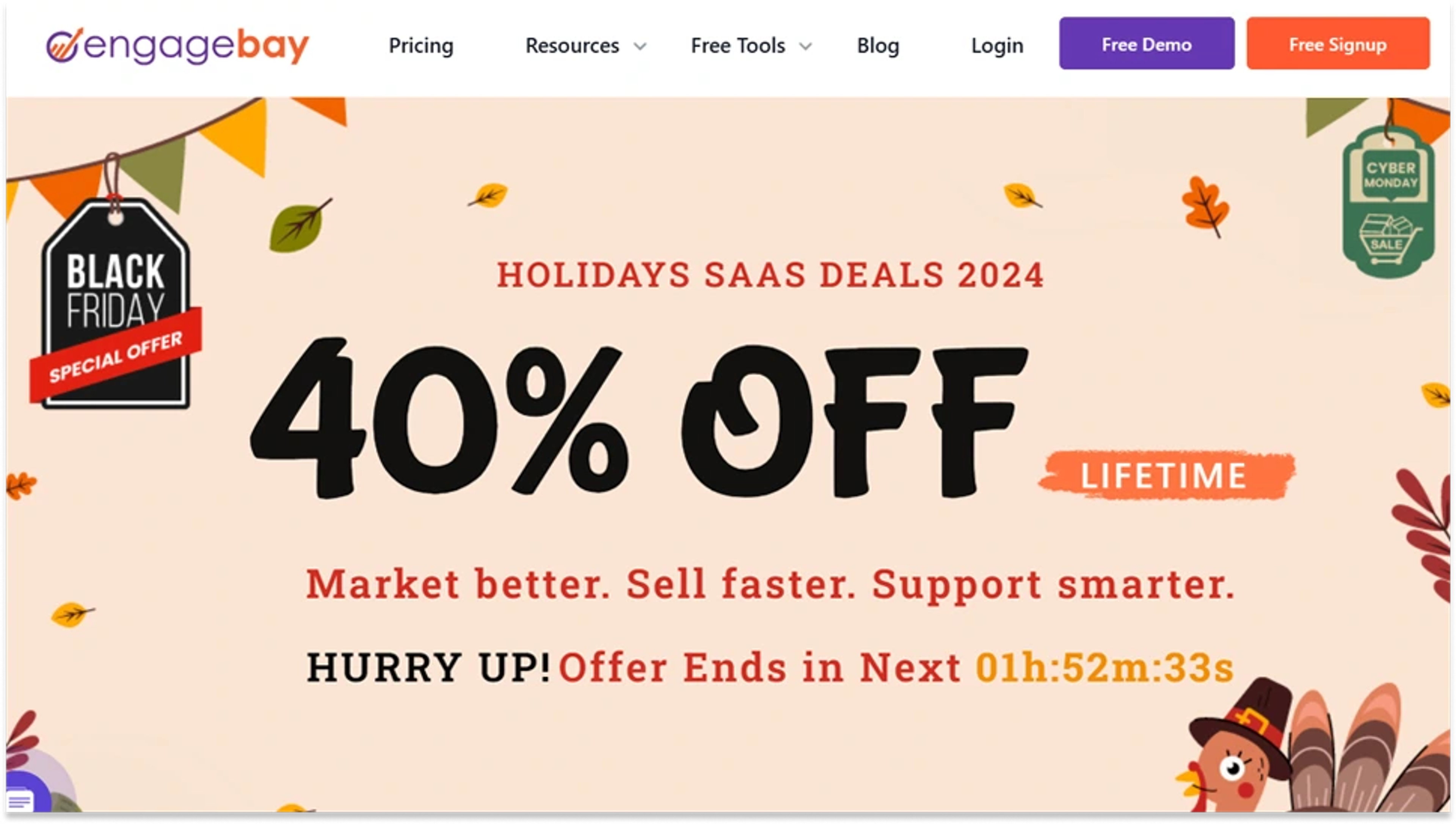 For example, EngageBay does this well by putting “Up to 40% Off for a Lifetime” at the top of their best Black Friday landing pages. It’s clear, direct, and immediately tells visitors what’s in.