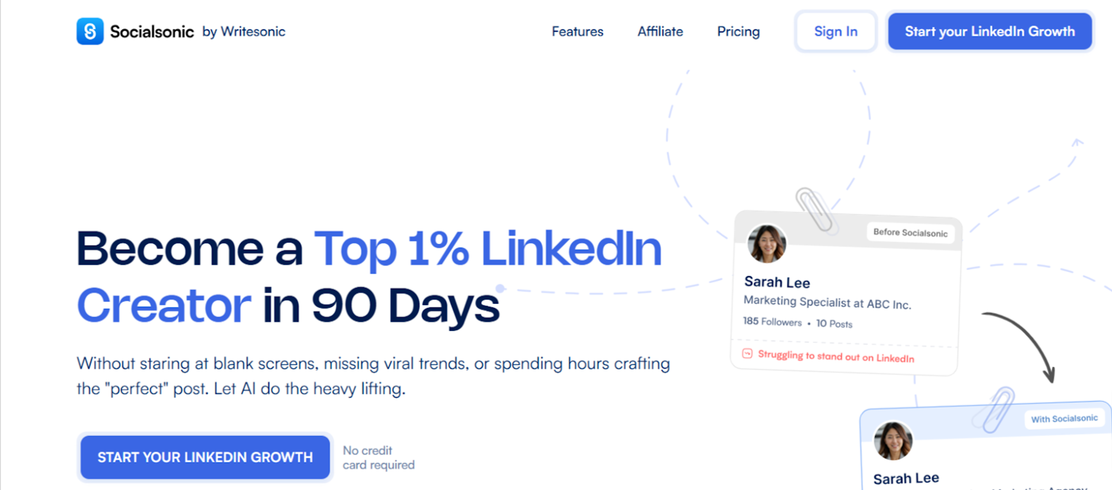 | Socialsonic | Starts at $39/mo billed yearly | AI-powered LinkedIn content creation | Generating trendy LinkedIn posts |