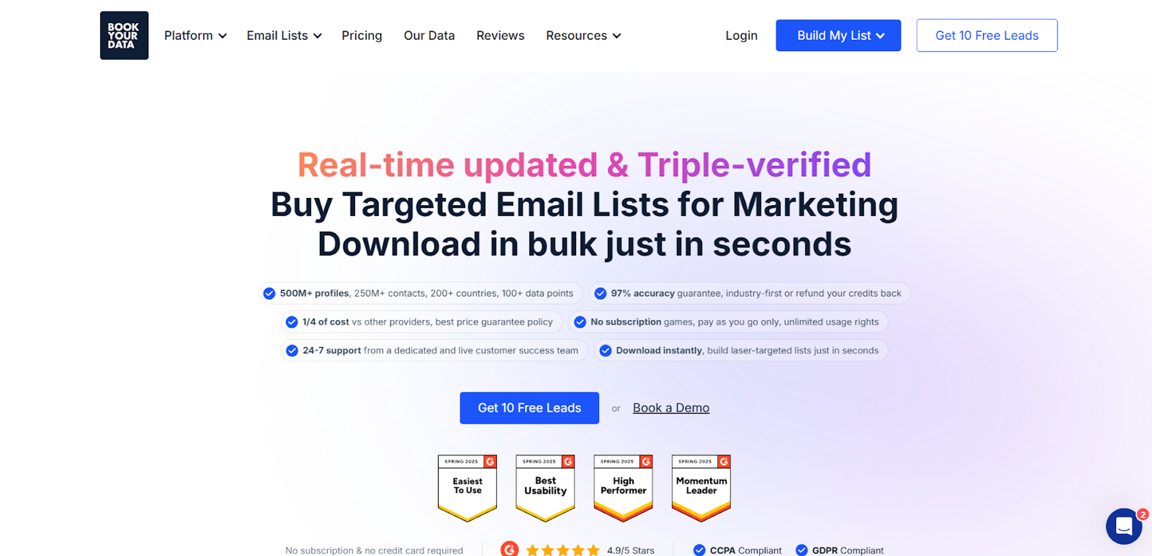 - BookYourData: Best for Building and Exporting Custom B2B Lead Lists Instantly