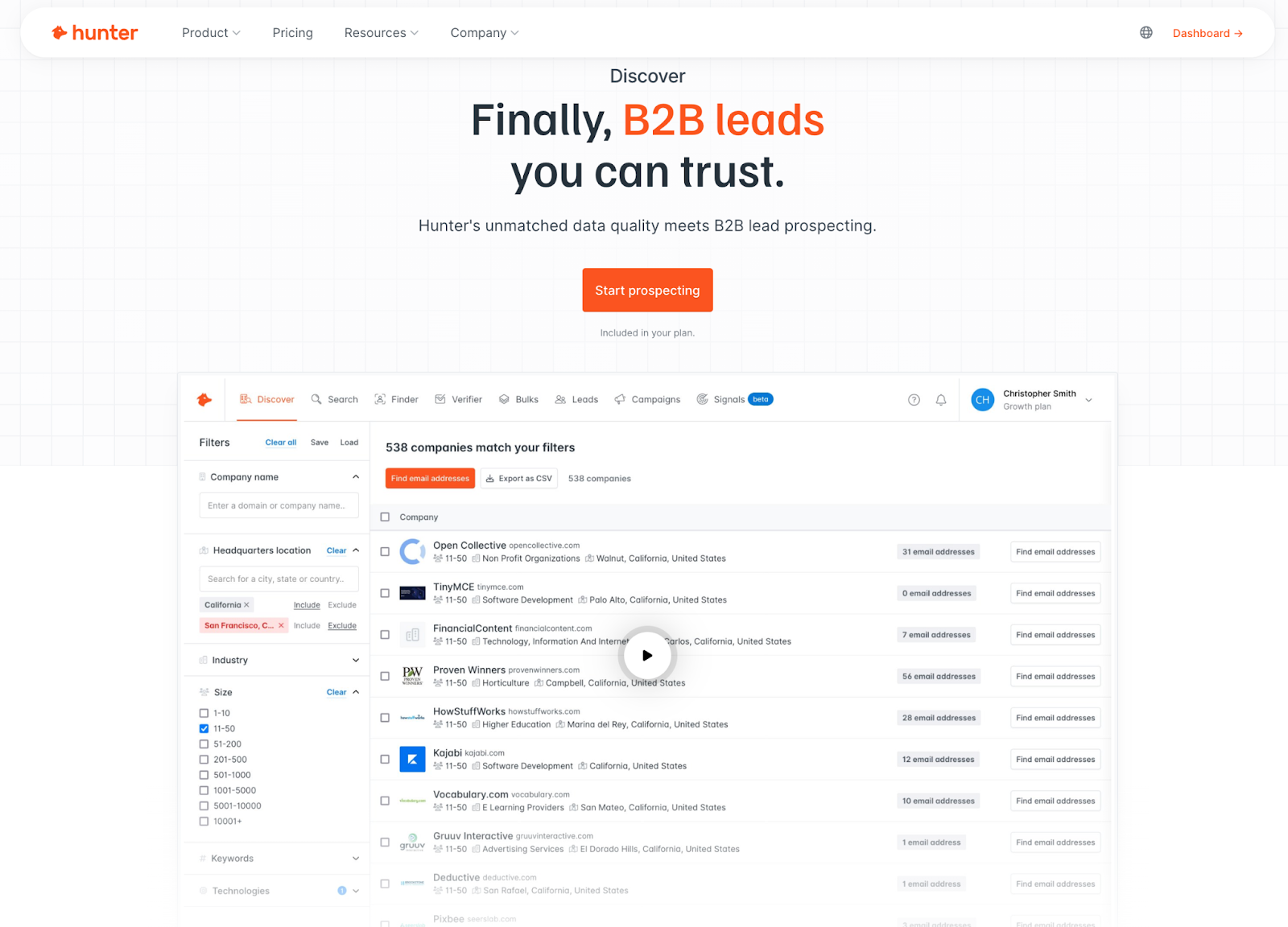 - Build highly targeted email lists based on specific filters like geography, company revenue, and industry.