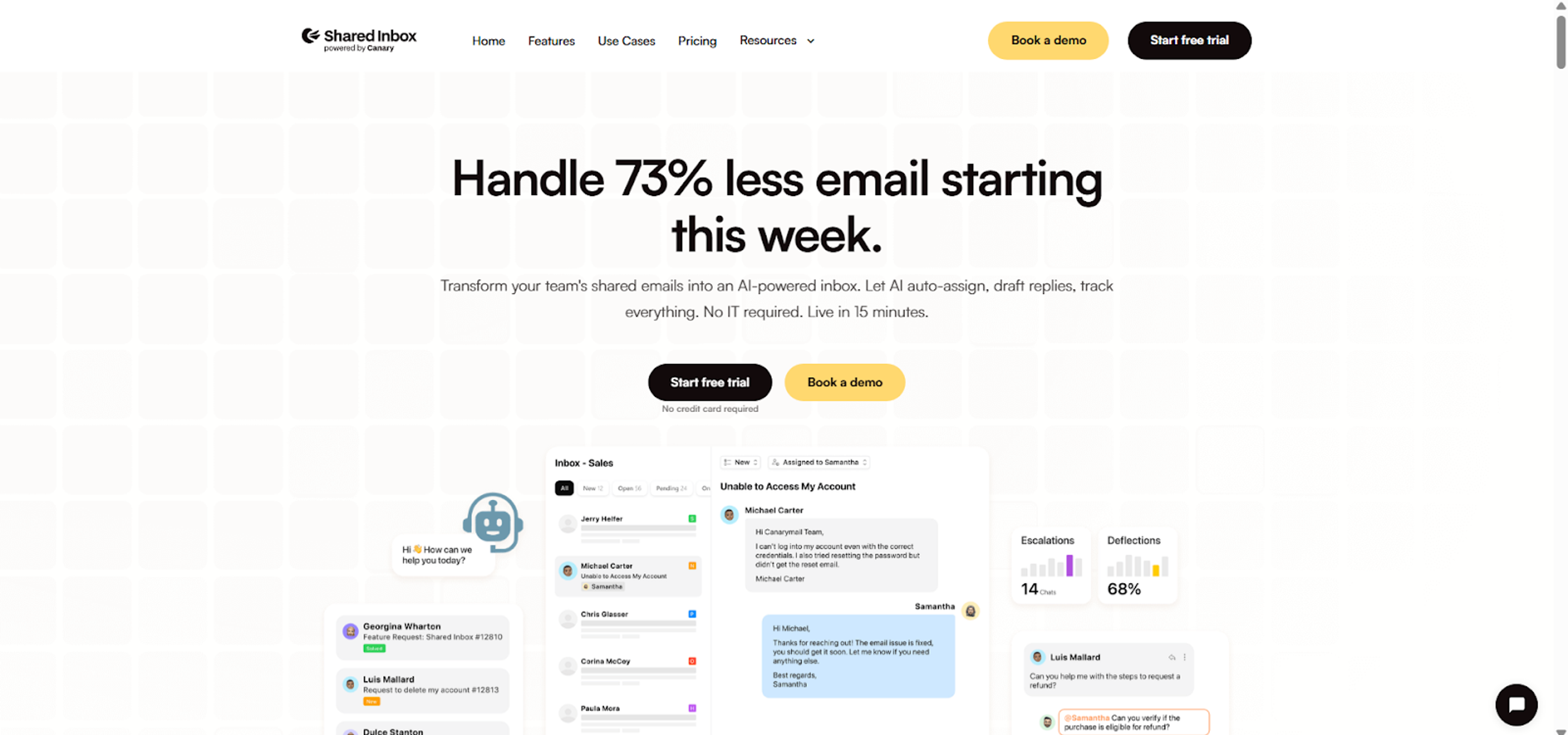 | Shared Inbox by Canary | Starts at $10/user/month | Smart Shared Inbox with AI Powered Chatbot, AI Suggested Replies, AI Top Issues Analyzer | Lead Capture, Support, and follow up via email |