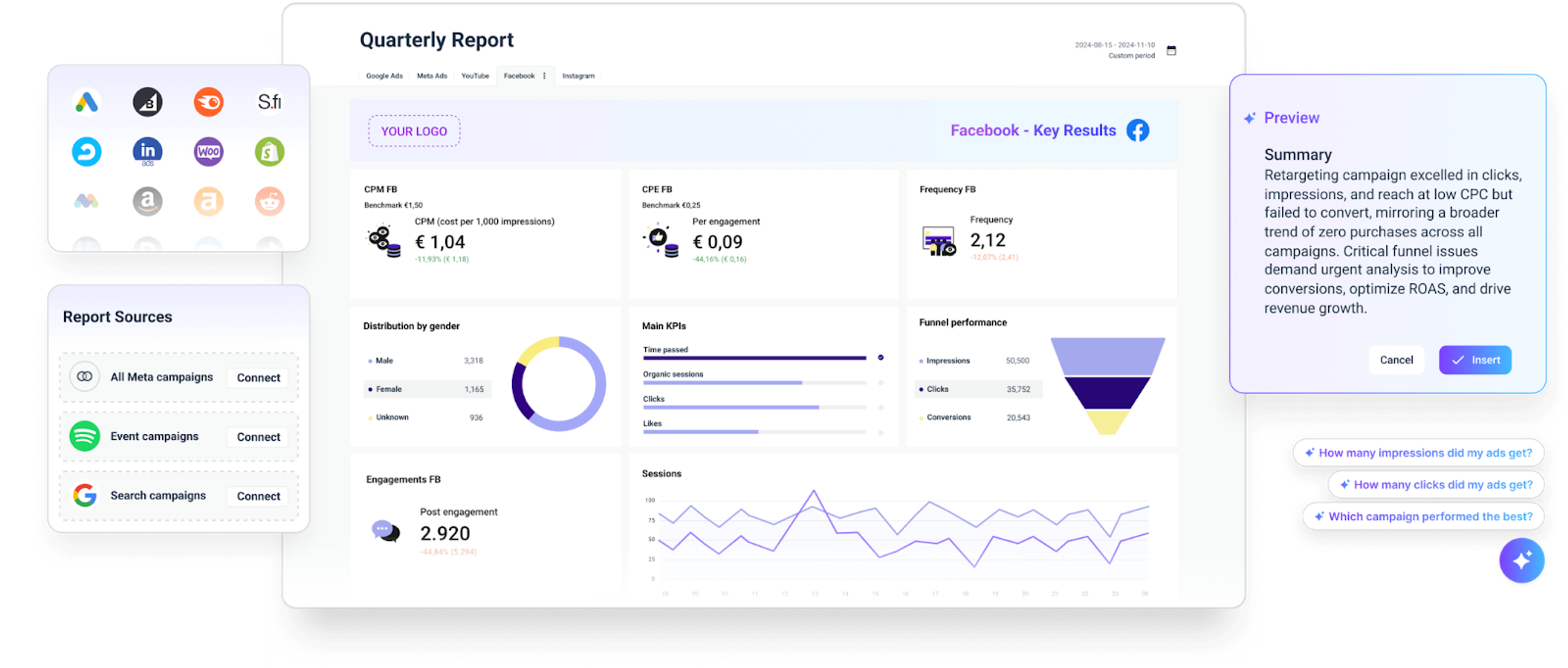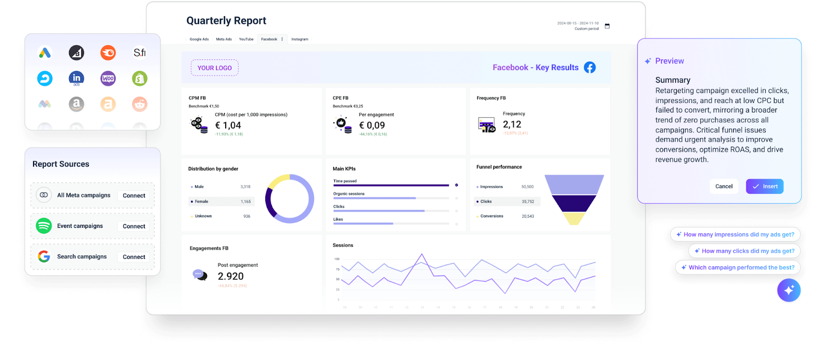 - AI analysis in cross-platform reports to help you understand your performance and get recommendations
