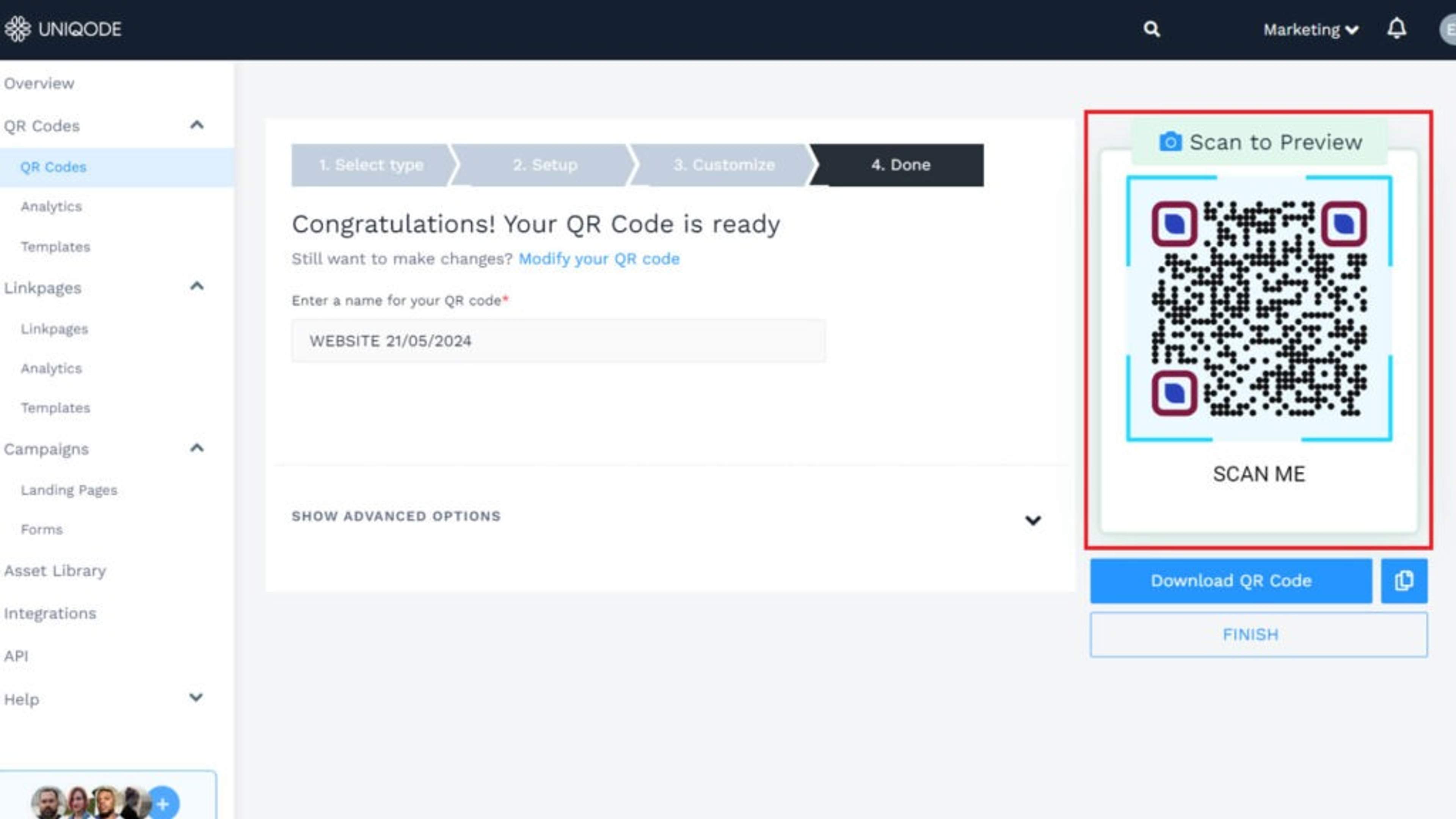 Note: As you customize your QR Code, the preview on the right will updated real-time. You can scan it with your phone to test it out.