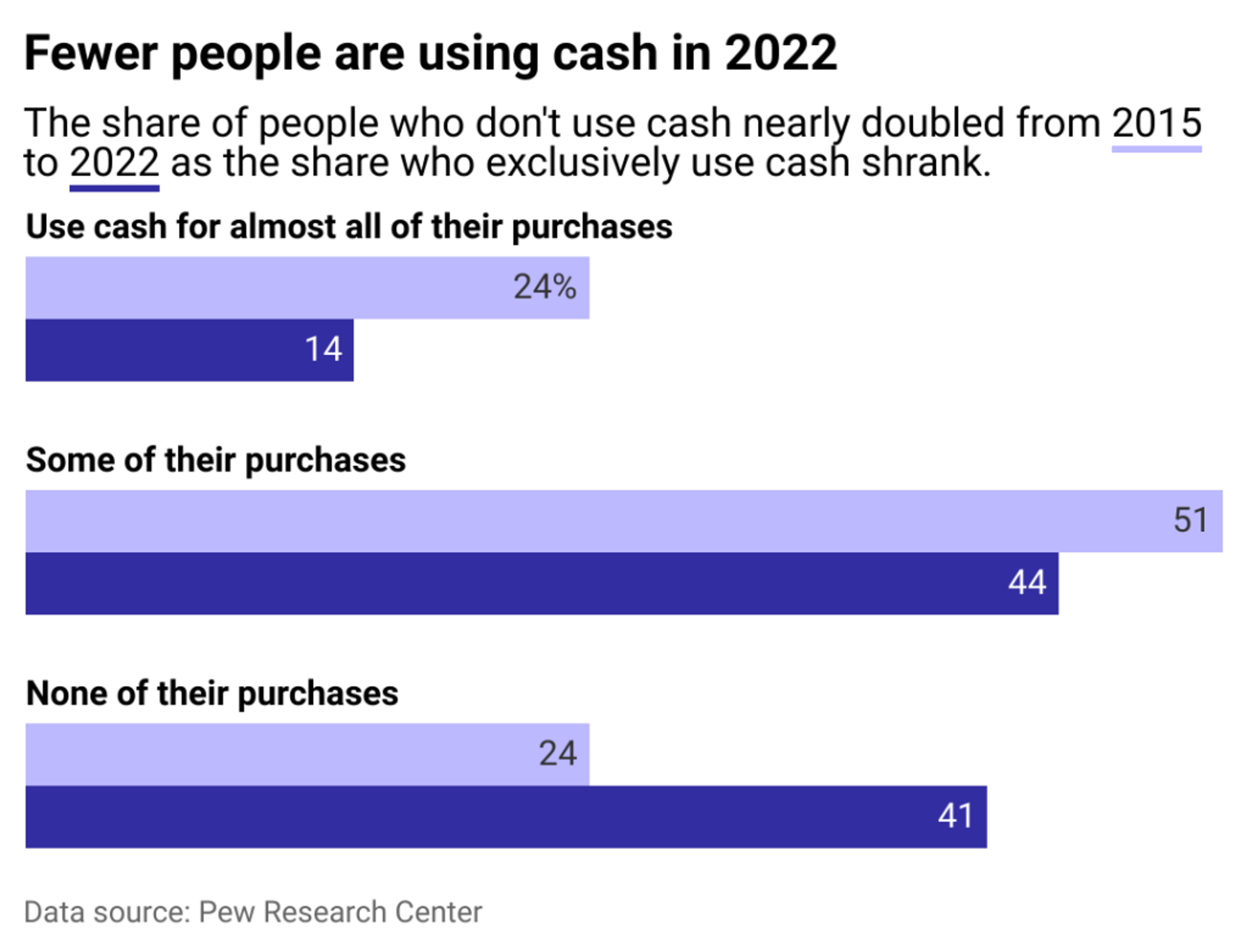 The U.S. is moving towards a cashless society. Pew Research Center survey data shows that about 2 in 5 people in the U.S. don’t use cash for any of their typical purchases, a sharp increase from 2015.
