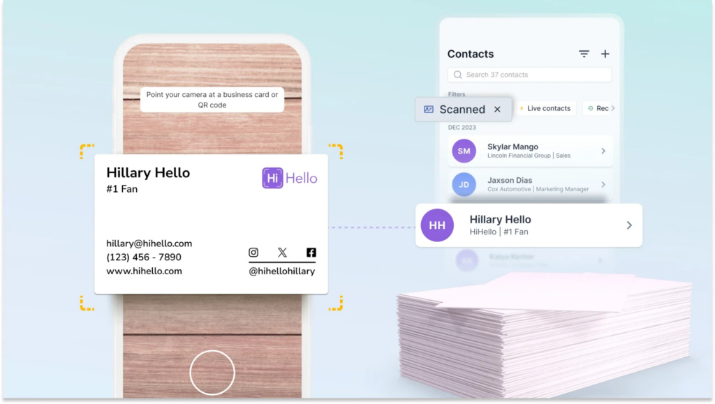By downloading HiHello’s mobile application, you can access its AI business card scanner to scan physical business cards. It converts the card details (text) to a digital format that can be loaded into your CRM. This is a helpful feature if you network with people who predominantly use paper cards.